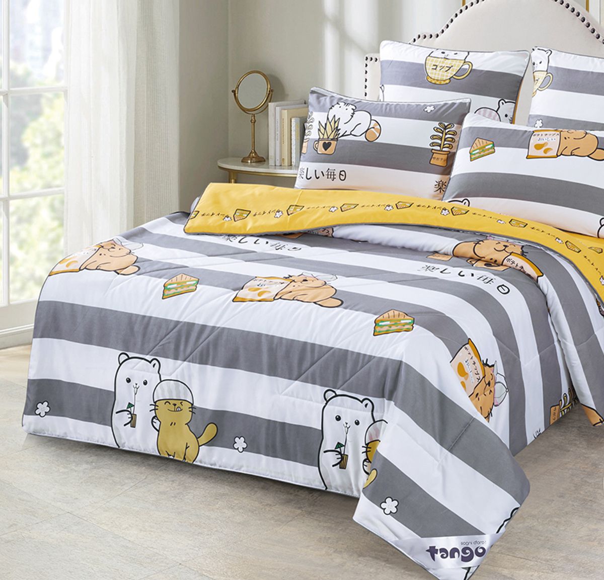 Комплект постельного белья с одеялом выполнен из ткани микросатин (50% хлопок, 50% полиэстер), плотной, прочной, износоустойчивой и очень красивой. Мягкость и блеск ее часто сравнивают с шелком. Наволочки оснащены удобной длинной застежкой на молнии, что значительно упрощает вкладывание туда подушек. Одеяло простёгано, что позволяет зафиксировать слой наполнителя. Плотность одеяла - средняя, что дает возможность использовать его круглый год. Постельное бельё изготовлено из цельной, широкой ткани без шва посередине простыни и наволочек, что увеличивает уровень комфорта таких изделий по сравнению с моделями, сшитыми из более узкой ткани. При правильном уходе (стирка не более 40 градусов), прослужит долго, сохранив форму и цвет. В действительности рисунок такой же яркий как на картинке. Швы аккуратные и ровные, так как пошив осуществляется на промышленном швейном оборудовании. Изготовитель - торговая марка «Tango», Турция/Китай. Вся продукция зарегистрирована в государственной системе маркировки и прослеживания «Честный знак».