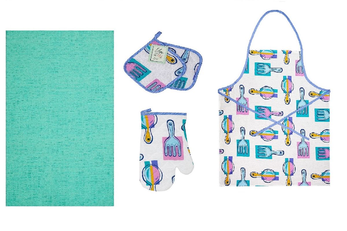 Набор для кухни "Мари Санна" Фартук Прихватка 2 шт Рукавичка Полотенце, Вилки-ложки+бирюза