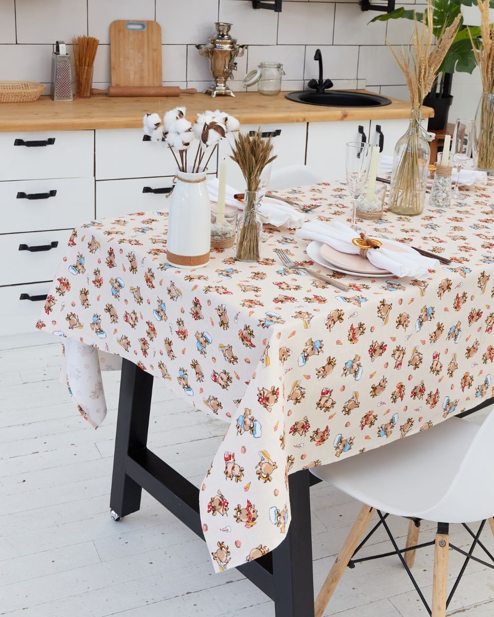 Скатерть на стол выполнена из 100% хлопковой ткани рогожка — это прочная, слегка грубоватая ткань. Ей характерна ярко выраженная фактура высокой плотности (165 гр/м). Скатерть на стол тканевая с плетением из рогожки не склонна к деформации. Она не мнется, не растягиваются и не садится, его сложно порвать или повредить. При правильном уходе (стирка не более 40 градусов) прослужит долго, сохранив форму и цвет. В действительности рисунок такой же яркий как на картинке (фото товара реальное, а не 3D графика). Продукция упакована в красивую подарочную упаковку (можно использовать для хранения). Швы аккуратные и ровные, так как пошив осуществляется на промышленном швейном оборудовании. Изготовитель торговая марка «Всё себе» — это свежий Российский бренд, работающий под девизом «зеленый мир каждому». Вся продукция производится в России, строго из 100% хлопка, имеет сертификацию качества «ГОСТ 33201-2014», а также зарегистрирована в государственной системе маркировки и прослеживания «Честный знак».